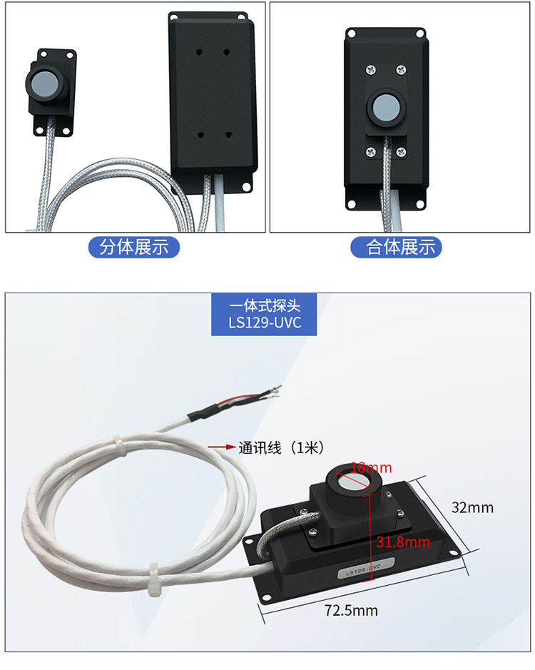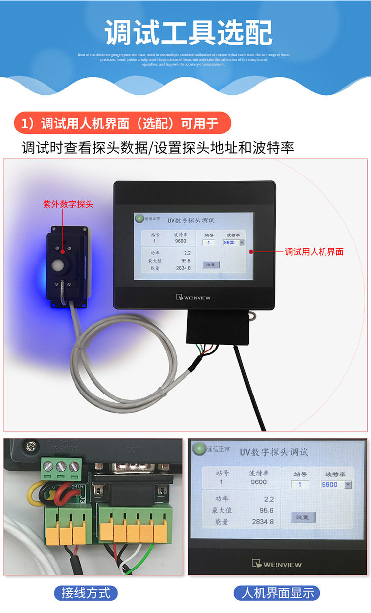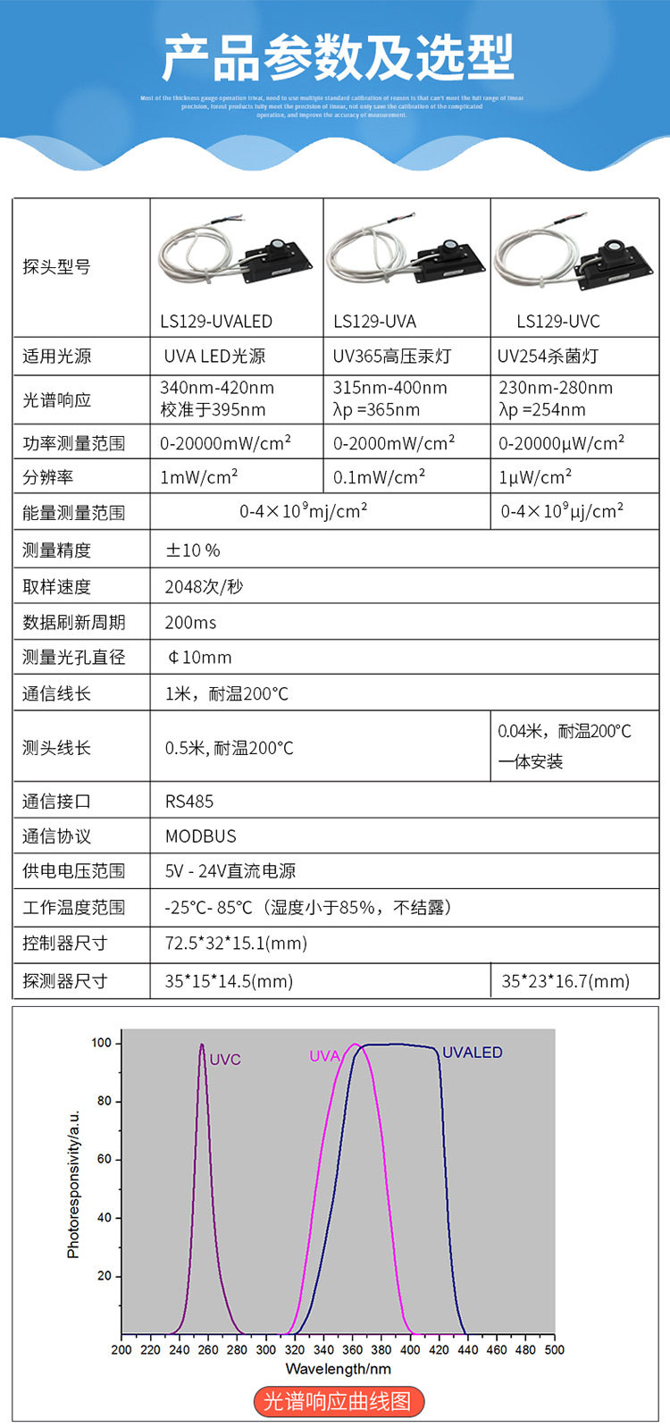 人機(jī)界面,電腦等設(shè)備通訊,實(shí)時(shí)數(shù)據(jù)采集和監(jiān)控。根據(jù)測(cè)試的紫外線光譜范圍,應(yīng)用行業(yè) 等的不同,目前開發(fā)了3種不同紫外線探頭: